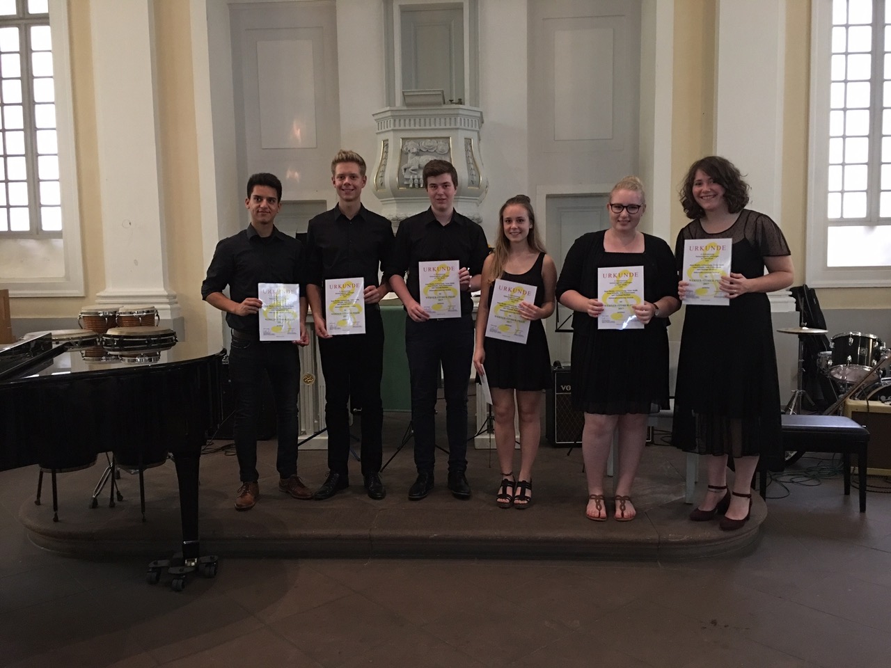 In diesem Jahr bekamen u.a. sechs AbiturientInnen des Hohenstaufen-Gymnasiums, die sich in unterschiedlichen Bereichen und über viele Jahre hinweg ins Musikleben der Schule mit ihrer ganzen Persönlichkeit und musikalischen Begabung eingebracht haben, den Preis der Werner-Stober-Stiftung überreicht. Die PreisträgerInnen Jonas Bender (E-Bass), Larissa Lang (Querflöte), Victor Moißl (Gitarre), Christoph Reichert (Violine), Anna Scheuble (Saxophon) und Jana Zimmermann (Querflöte) besuchten von der 8.-10. Klasse das Musikprofil. In der Tradition des eigenständigen Arbeitens im Musikprofil arrangierten sie für die Preisverleihung einen Song und studierten diesen während der Abiturvorbereitung selbstständig ein. Beim Preisträgerkonzert am 22.6.17 in der kleinen Kirche am Markt im Zentrum von Karlsruhe musizierten sie unter Gleichgesinnten anderer Musikprofil-Gymnasien ein musikalisch berührendes und handwerklich sehr überzeugendes „When we were young“ von Adele.