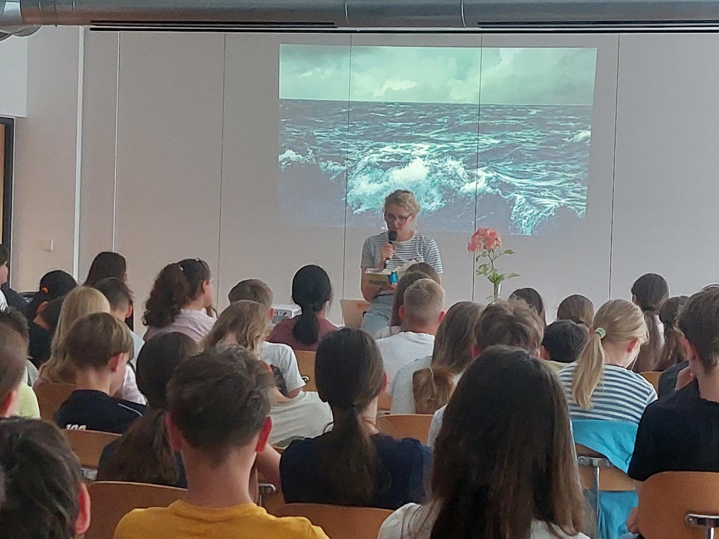 Eine persönliche Begegnung mit einer aktuellen Jugendbuchautorin und ihrem Werk konnten die siebten Klassen und die Klasse 5b des Hohenstaufen-Gymnasiums Eberbach am Montag, 24.06.2025 erleben. Annika Scheffel war aus Berlin angereist und stellte ihren Jugendroman „Sommer auf Solupp“ in einer Lesung vor. Die Klasse 7a, die den Roman im Deutschunterricht besonders intensiv bearbeitet, konnte im Anschluss noch einen Workshop mit der Autorin ihrer Klassenlektüre zur Entwicklung des persönlichen Schreibstils durchführen.