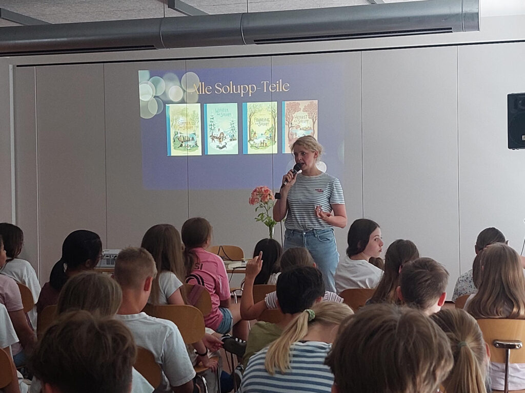 Viele Schülerfragen zur Inspiration, Lieblingsfiguren oder der Arbeitsweise von Autorinnen oder Autoren beantwortete Annika Scheffel sehr ausführlich und persönlich. Der abschließende anhaltende Applaus und der Ansturm auf Autogrammkarten zeigten das große Interesse vieler Schülerinnen und Schüler. „Bei der Buchvorstellung in der Klasse dachte ich schon, dass das Buch interessant ist, aber nach der Lesung werde ich es mir auf jeden Fall kaufen,“ bestätigt das ein Fünftklässler. Und auch mehrere weitere Schülerinnen und Schüler zeigten Interesse an weiteren Büchern der Autorin, von der es nicht nur alle Jahreszeiten auf Solupp in vier Bänden zu erleben gibt, sondern auch weitere Kinder- und Jugendbücher, Romane und Theaterstücke.