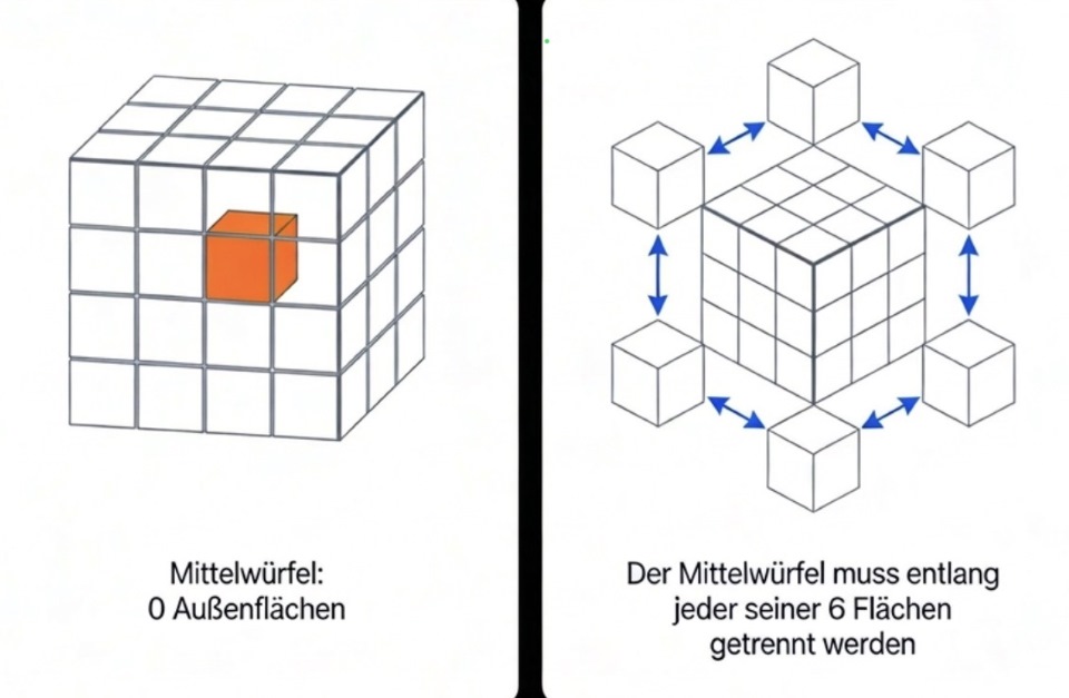 Die verblüffende Lösung: Die richtige Antwort lautet, dass zwingend sechs Schnitte erforderlich sind. Der Grund dafür ist der unsichtbare kleine Würfel genau im Zentrum des großen Holzwürfels, der keine einzige Außenfläche besitzt. Um diesen mittleren Würfel von seinen Nachbarn zu trennen, ist für jede seiner sechs Flächen ein eigener Schnitt nötig.
