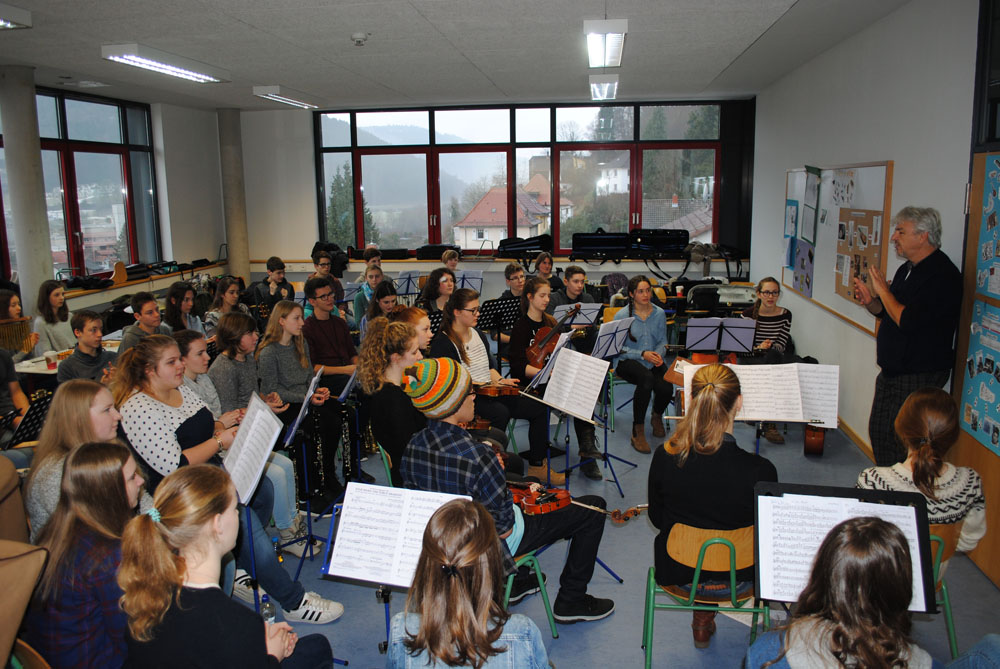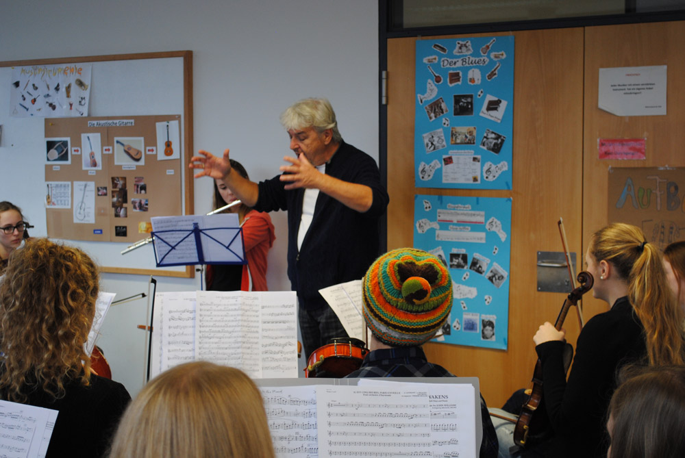 Klaus Wagenleiter (SWR) hält einen Workshop am HSG mit dem Symphonic-Jazz-Orchestra